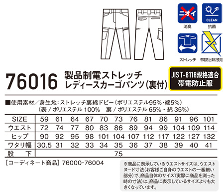 76016/製品制電ストレッチレディースカーゴパンツ(裏付) |