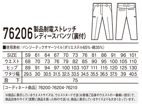 76206/製品制電ストレッチレディースパンツ(裏付) |