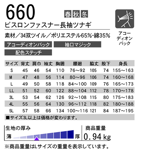 ビスロンファスナー長袖ツナギ/660