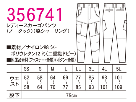 356741/レディースカーゴパンツ(ノータック)(脇シャーリング) |