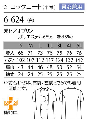 品名 コックコート(半袖) [男女兼用]