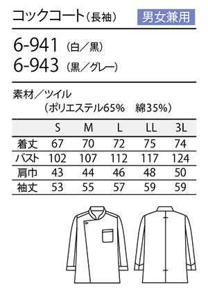 住商モンブラン(MONTBLANC) クッキング サービスユニフォーム 6-941.6-943/コックコート(長袖)