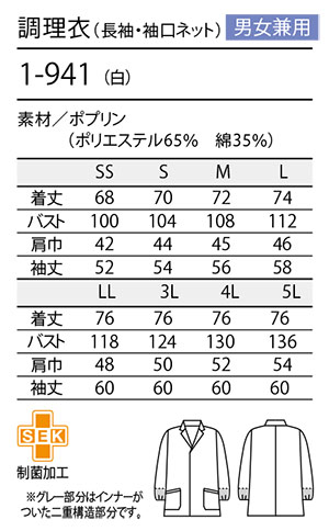 | 男女兼用 調理衣(長袖・袖口ネット) |