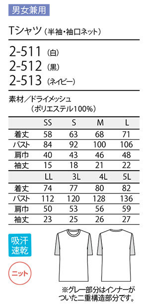 | 男女兼用 Tシャツ (半袖・袖口ネット) |