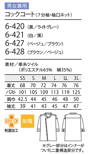 住商モンブラン(MONTBLANC) クッキングサービスユニフォーム 6-420.6-421.6-427.6-428/コックコート(7分袖・袖口ネット)