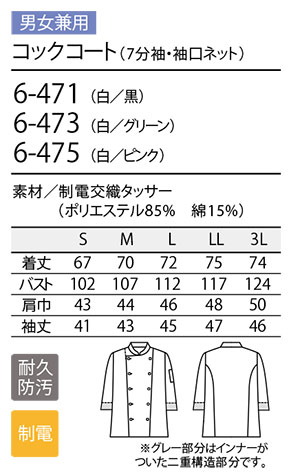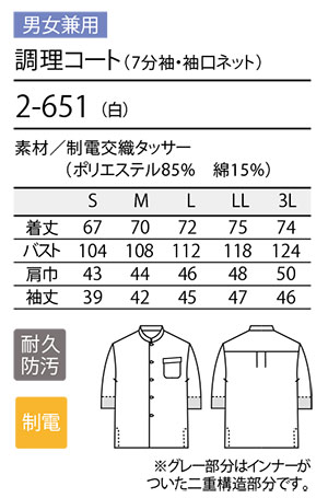 調理コート(7分袖・袖口ネット) [男女兼用] |