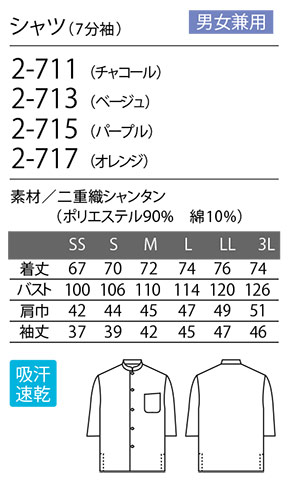住商モンブラン(MONTBLANC) クッキング サービスユニフォーム 2-711.2-713.2-715.2-717/シャツ(7分袖)