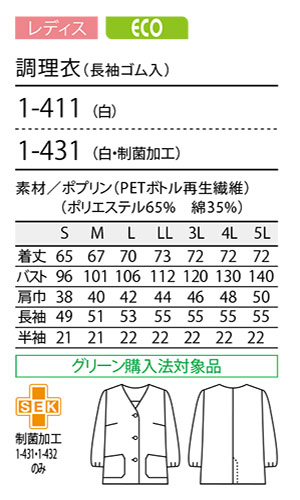 調理衣 (長袖ゴム入り) [レディス] ECO |