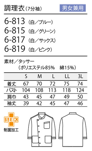 住商モンブラン(MONTBLANC) クッキング サービスユニフォーム 6-813.6-815.6-817.6-819/調理衣(7分袖)