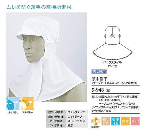 男女兼用 頭巾帽子 (ケープ付・メガネ差し付・マスク留め付) |