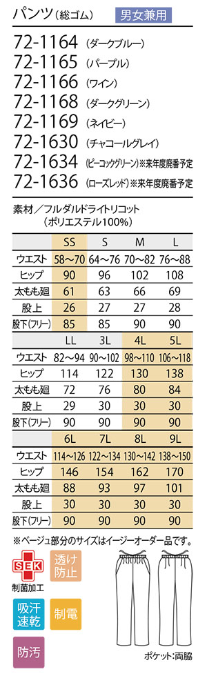 住商モンブラン(MONTBLANC) メディカルユニフォーム 72-1164.72-1165.72-1166.72-1168.72-1169.72-1630.72-1634.72-1636/パンツ(総ゴム)