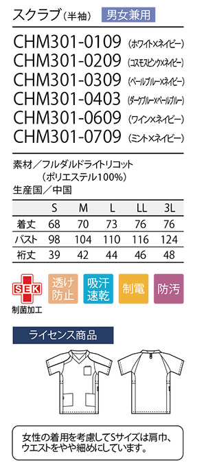 CHM301/男女兼用 スクラブ(半袖)