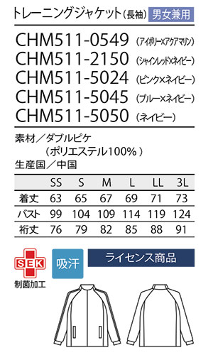 CHM511/男女兼用 トレーニングジャケット(長袖) ・ CHM611/男女兼用 トレーニングパンツ(総ゴム)