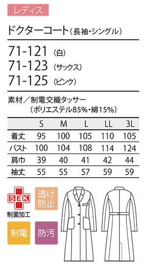 住商モンブラン(MONTBLANC) メディカルユニフォーム 71-121.71-123.71-125/ドクターコート(長袖・シングル)