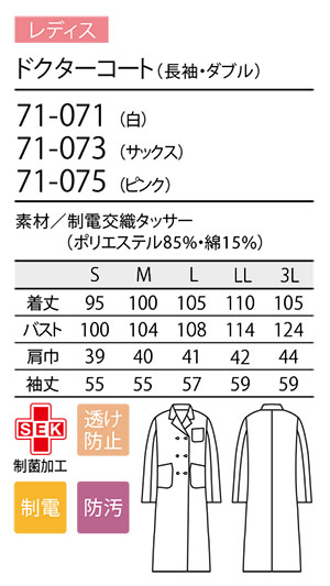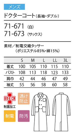 住商モンブラン(MONTBLANC) メディカルユニフォーム 71-671.71-673.71-071.71-073.71-075/ドクターコート(長袖・ダブル)