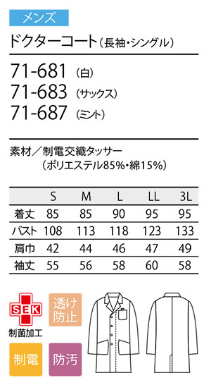 住商モンブラン(MONTBLANC) メディカルユニフォーム 71-681.71-683.71-687.71-081.71-083.71-085.71-087/ドクターコート(長袖・シングル)
