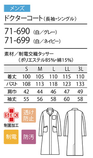 住商モンブラン(MONTBLANC) メディカルユニフォーム 71-690.71-699.71-090.71-099/ドクターコート(長袖・シングル)