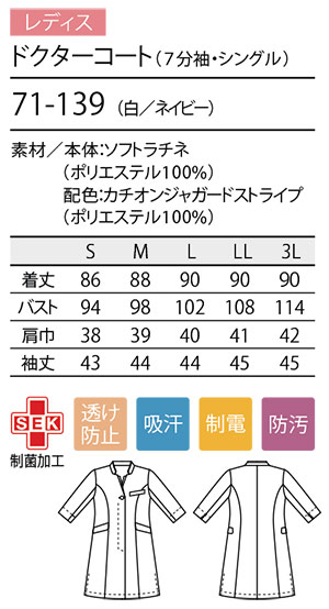 | 71-139/レディス ドクターコート(7分袖・シングル) |