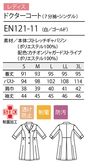 EN121-11/レディス ドクターコート(7分袖・シングル)