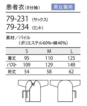 79-231・79-234/男女兼用 患者衣(8分袖)