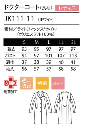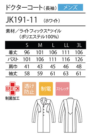 JK111/レディス ドクターコート(長袖) ・ JK191/メンズ ドクターコート(長袖)