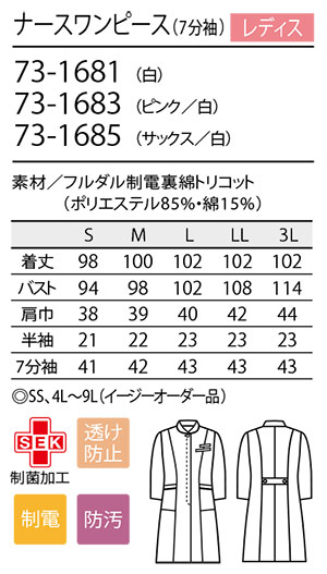住商モンブラン(MONTBLANC) メディカルユニフォーム 73-1682.73-1684.73-1686/ナースワンピース(半袖)・73-1681.73-1683.73-1685/ナースワンピース(7分袖)