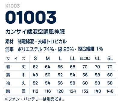 K1004/01004 カンサイ綿混半袖空調風神服 |