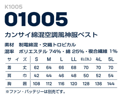 K1005/01005 カンサイ綿混空調風神服ベスト |