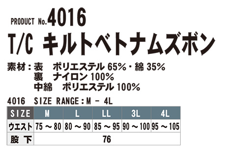 SHINMEN(シンメン株式会社) 秋・冬シーズン 作業服 4016/T/Cキルトベトナムズボン