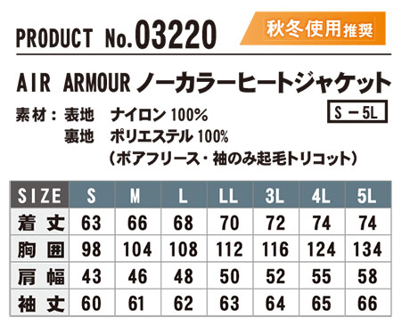 03220/AIR ARMOUR ノーカラーヒートジャケット |