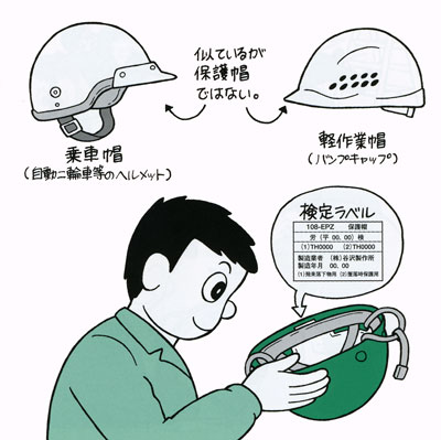 | 保護帽は必ず検定合格品を選びましょう。乗用車ヘルメットや軽作業帽(バンプキャップ)は、性能や保護機能が異なります。 |