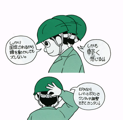 自分の頭に合わせてきちんと調節するとヘルメットがぐらつかず快適に着用できます。EPA(エバ)ならば、被ったまま片手で簡単にジャストフィットできます。
