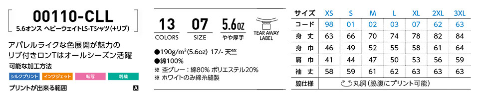 5.6オンス ヘビーウェイトLS-Tシャツ(+リブ) |