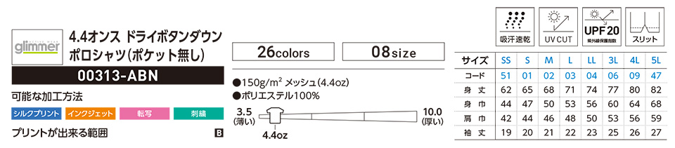 00313-ABN/4.4オンス ドライボタンダウンポロシャツ(ポケット無し)