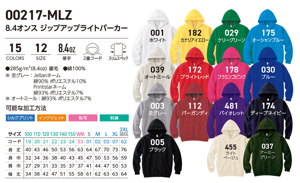 衣料百貨大槻 プリントウェア トムス株式会社(プリントスター) 00217-MLZ 8.4オンス ジップアップライトパーカー
