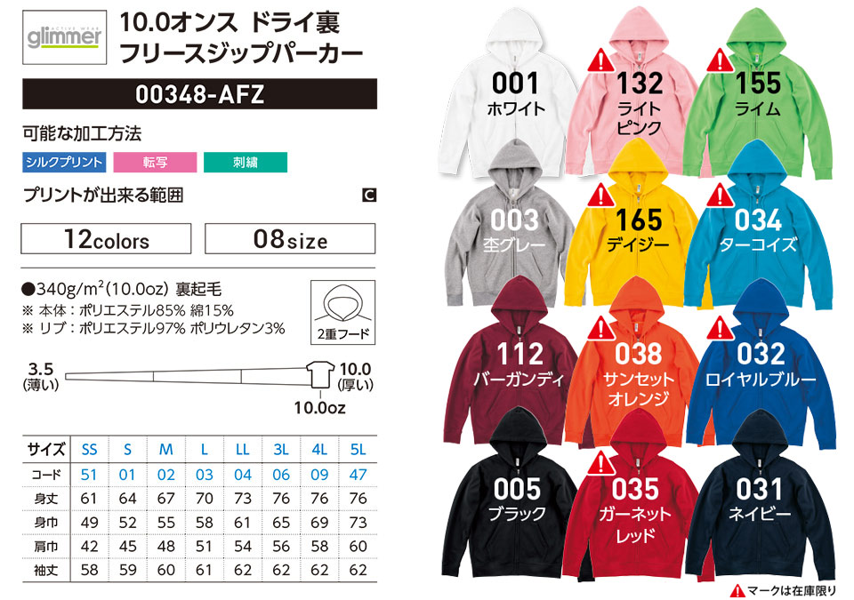 | 00348-AFZ/10.0オンス ドライ裏フリースジップパーカー |
