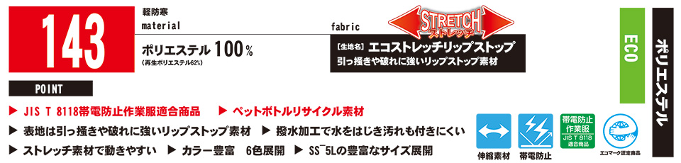 ユニフォーム&安全靴のジーベック 【XEBEC】 秋・冬用防寒作業服(ウインターウェア)軽防寒 143/制電軽防寒ブルゾン